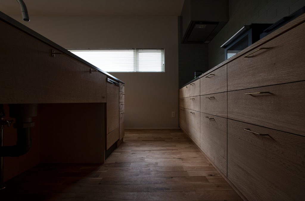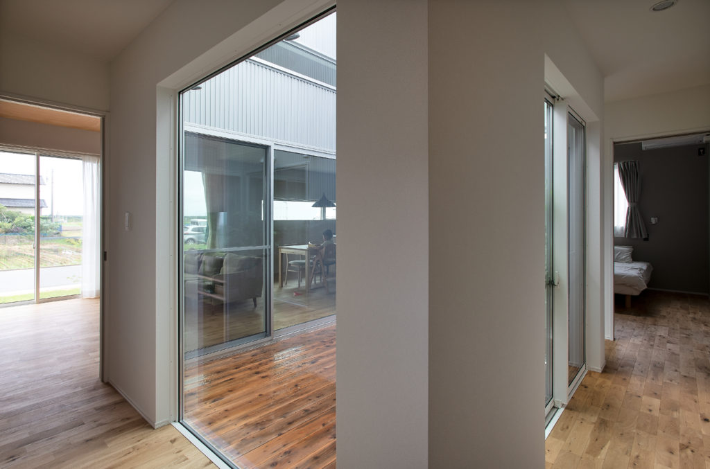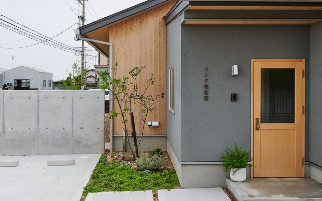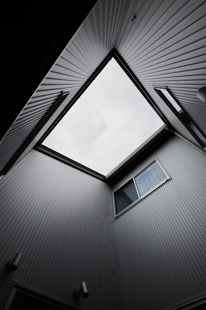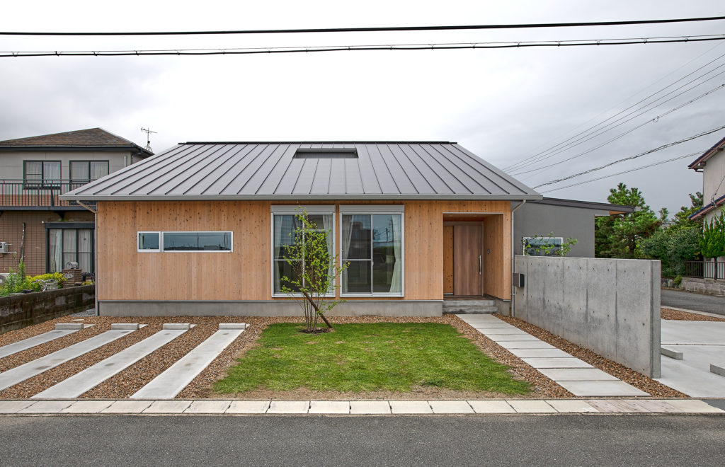 平屋風一部2階建てのお家です。南面に車通りがある道路に接しているため、完全プライベート空間を中庭として建物中央に配置しました。この中庭空間を軸にご家族様のご生活がどこにいても感じられる設計になっております。